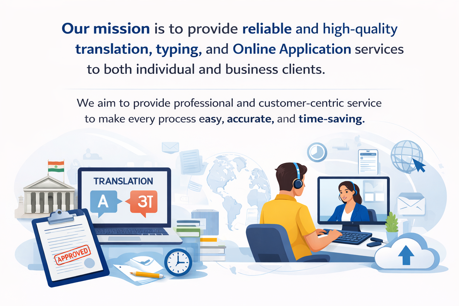 અમારું ધ્યેય વ્યક્તિગત તેમજ વ્યવસાયિક ગ્રાહકોને વિશ્વસનીય અને ઊંચી ગુણવત્તાવાળી અનુવાદ (Translation), ટાઇપિંગ (Typing) અને ઓનલાઇન એપ્લિકેશન (Online Application) સેવાઓ પ્રદાન કરવાનો છે. અમે દરેક પ્રક્રિયાને સરળ, ચોક્કસ અને સમય બચાવનારી બનાવવા માટે વ્યાવસાયિક અને ગ્રાહકકેન્દ્રિત સેવા આપવાનું લક્ષ્ય ધરાવીએ છીએ.